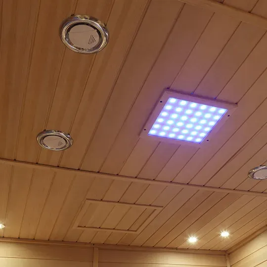 3. Pengalaman Pemanasan & Pencahayaan: Panel pemanas inframerah jauh teragih sekata memberikan haba yang lembut dan menembusi; lampu ambien atas + sisi (dalam nada hangat) meningkatkan kelonggaran dan mengelakkan kesesakan atau penindasan