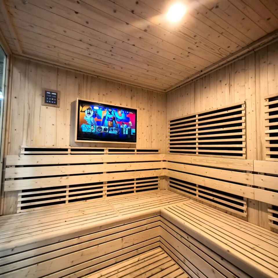 TV LCD terbina dalam (kelihatan dalam imej) mengubah pengalaman sauna: