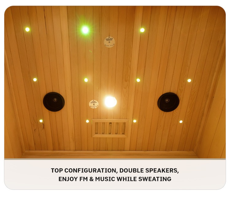Sistem dwi-pembesar suara dikonfigurasikan di bahagian atas, menyokong radio FM dan main semula muzik. Anda boleh menikmati melodi kegemaran anda atau program radio sambil berpeluh, meningkatkan pengalaman sauna yang mengasyikkan.