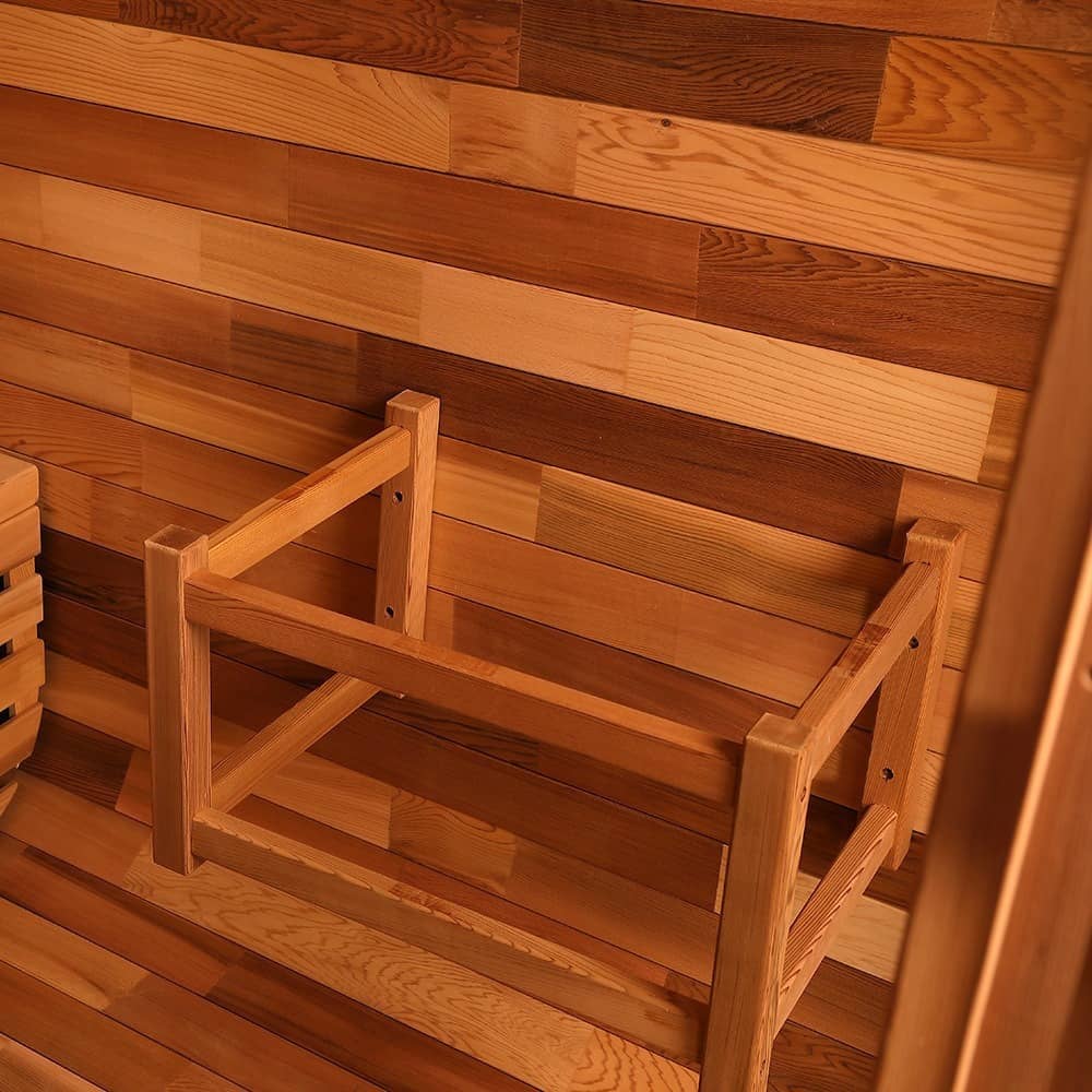 - Bahan Utama: Kayu padu tahan haba berkualiti tinggi digunakan di seluruh (dinding, bangku dan bingkai semuanya kayu padu), dirawat secara profesional untuk kelembapan dan rintangan haba untuk menyesuaikan diri dengan persekitaran sauna suhu tinggi dan kelembapan tinggi.
