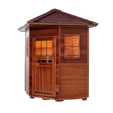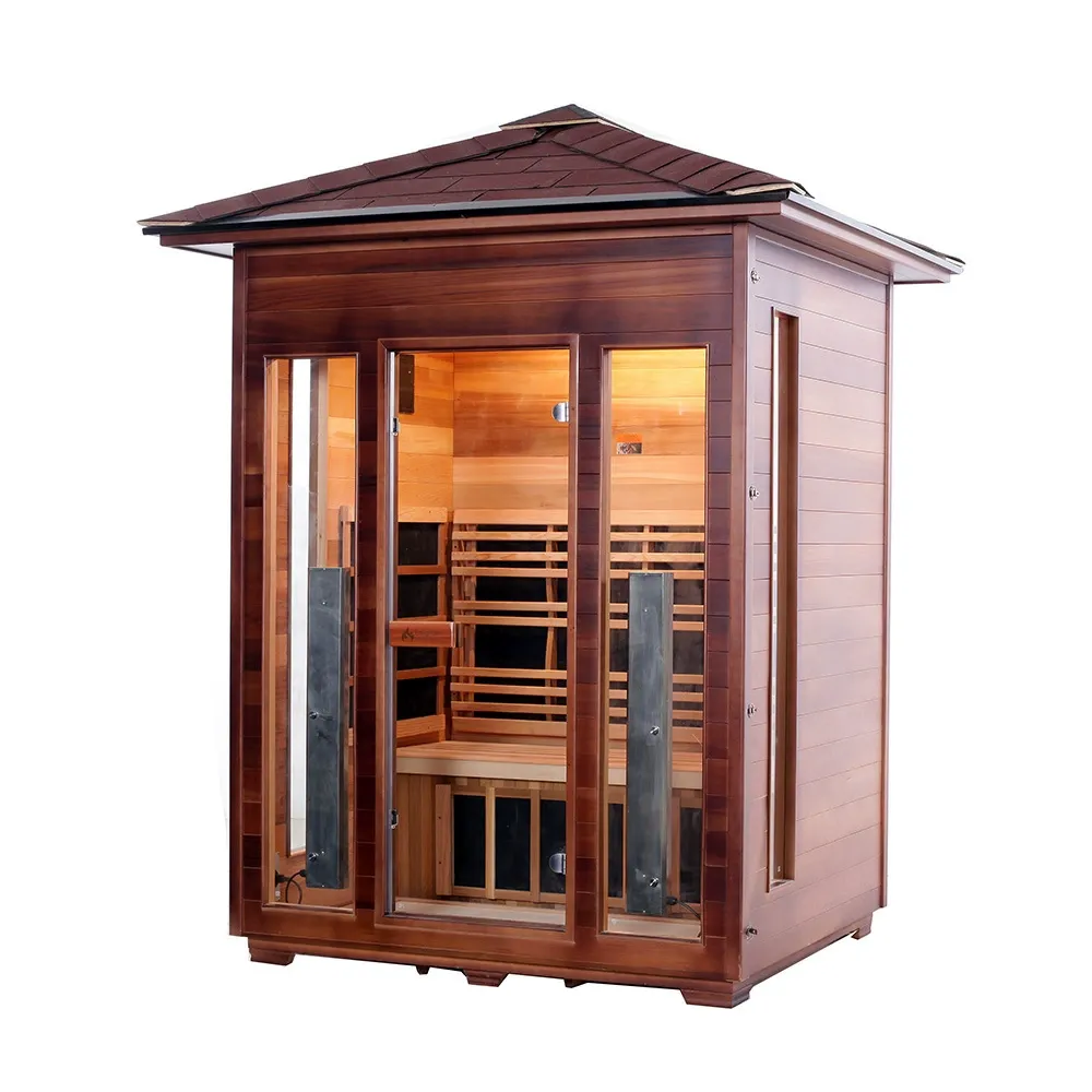 Sauna luar ini dibuat dari cedar merah Kanada atau hemlock Kanada. Kayu ini mempunyai rintangan kakisan dan kelembapan serta kestabilan struktur. Dilengkapi dengan teknologi pemanasan serat karbon yang jauh, ia memanaskan dengan cepat dan mengedarkan haba secara merata. Sesuai untuk persekitaran luaran seperti halaman, balkoni, taman villa, kawasan kolam renang, dan pusat peranginan.