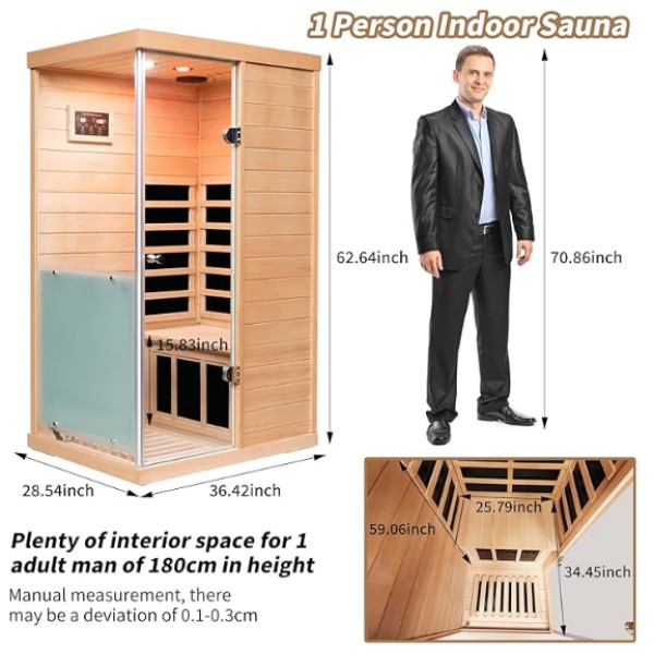 · 【Jejak Kecil, Mudah Dipasang】: Sauna inframerah 1 orang Jejak kecil, boleh digunakan di bilik tidur, bilik mandi dan gim pada bila-bila masa. Saiz dalaman ialah 34.45*25.79*59.06 inci, yang boleh memuatkan orang dewasa dengan ketinggian 180CM, dan tempat duduk boleh menanggung beban maksimum 100KG. Reka bentuk lidah dan alur, mudah dipasang, disertakan dengan arahan pemasangan, dan boleh dipasang dalam masa 30 minit.