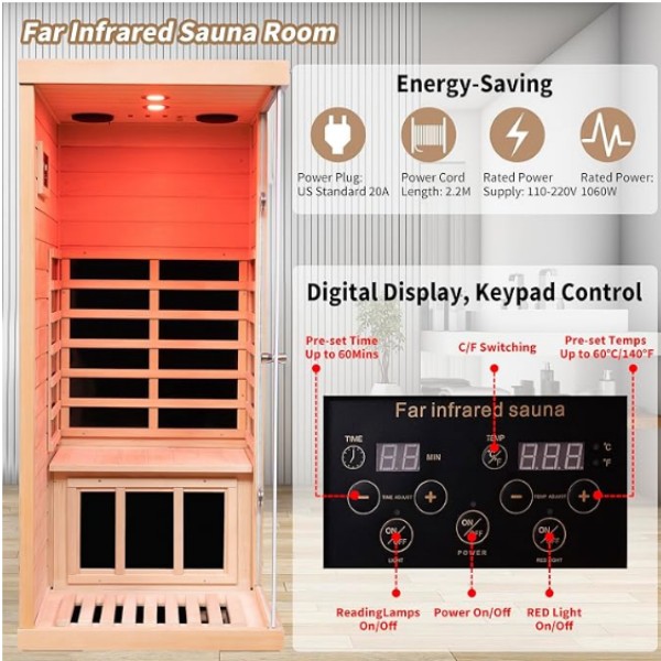 · 【Keselamatan, Gunakan dengan Keyakinan】: Paparan digital, sistem kawalan butang, masa dan suhu boleh ditetapkan, masa pratetap adalah sehingga 60 minit, dan suhu pratetap adalah sehingga 60° (140℉). Sistem kawalan suhu yang dimanusiakan, perlindungan suhu 110°. Jika kebocoran elektrik berlaku semasa penggunaan sauna inframerah jauh kami, peranti perlindungan secara automatik memotong bekalan kuasa.
